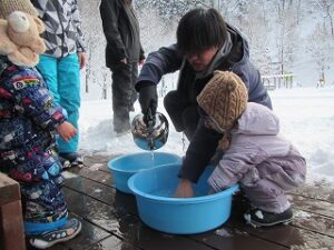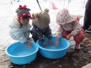 色水もソリもがっつり楽しむ子どもたちとふるえて見守る大人たち