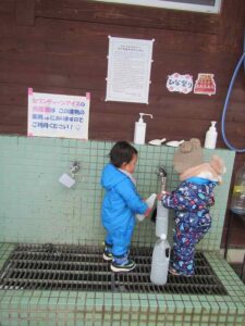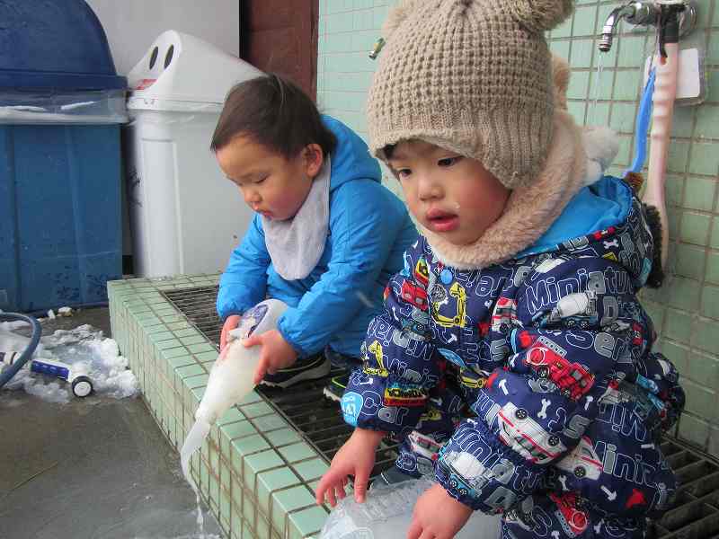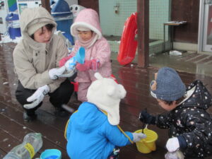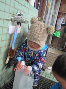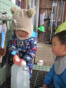 子どもたちは厳しい寒さの中、手袋もせずに水あそび!